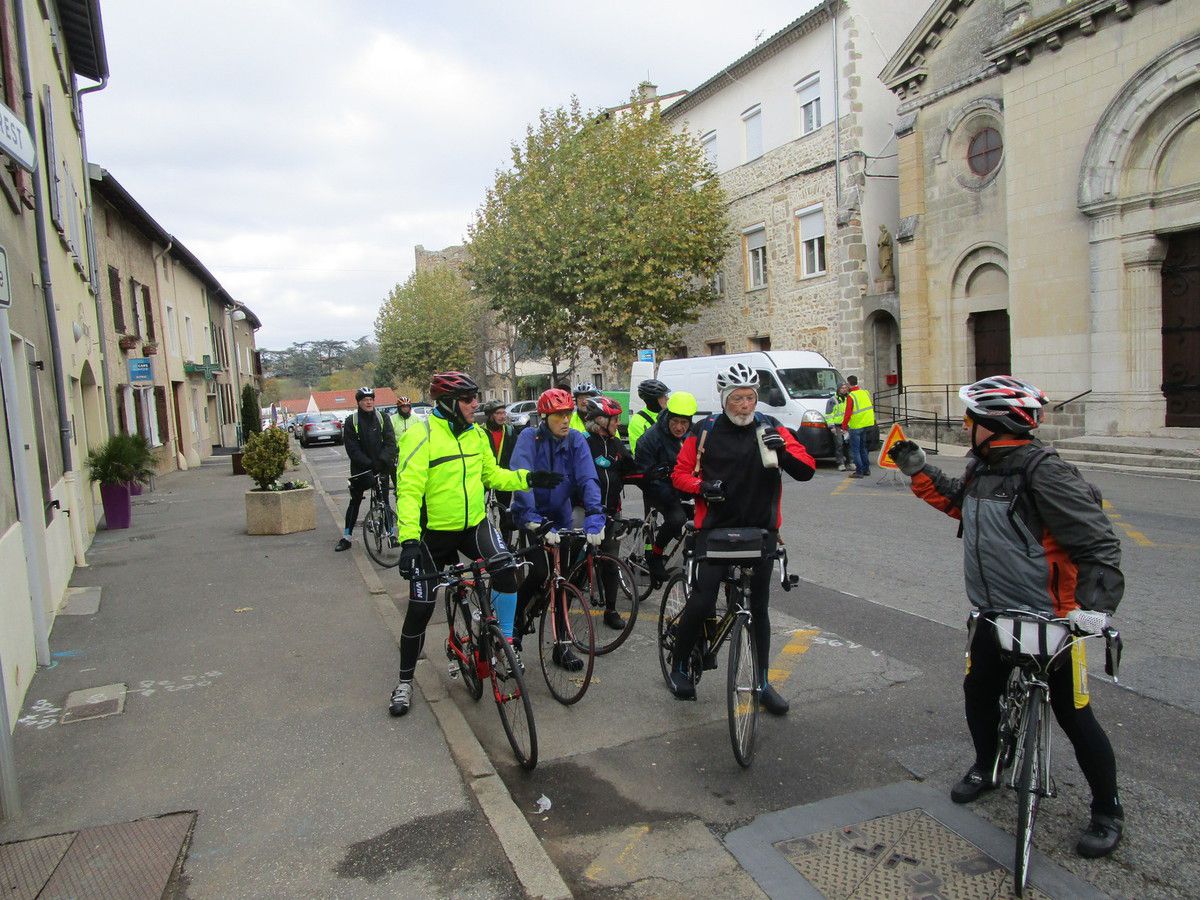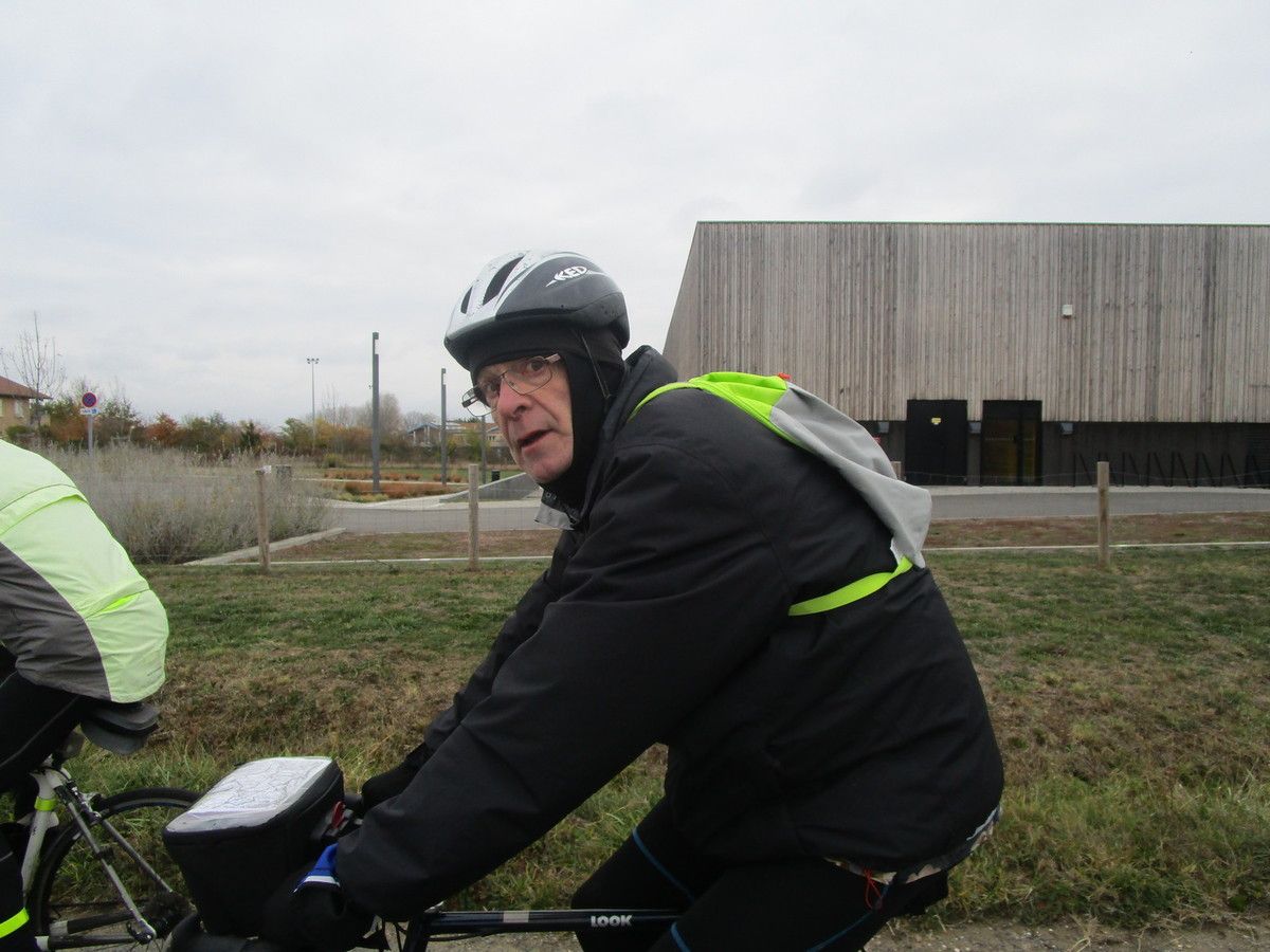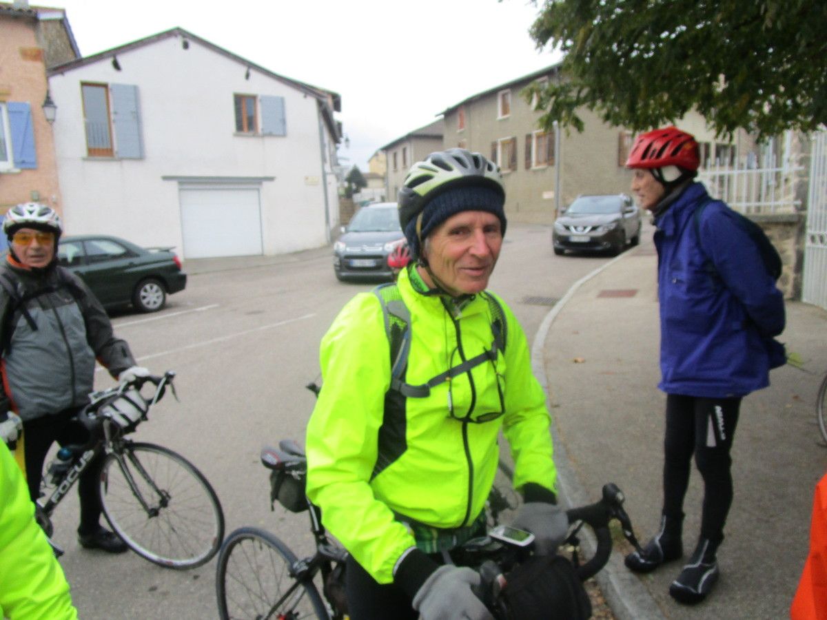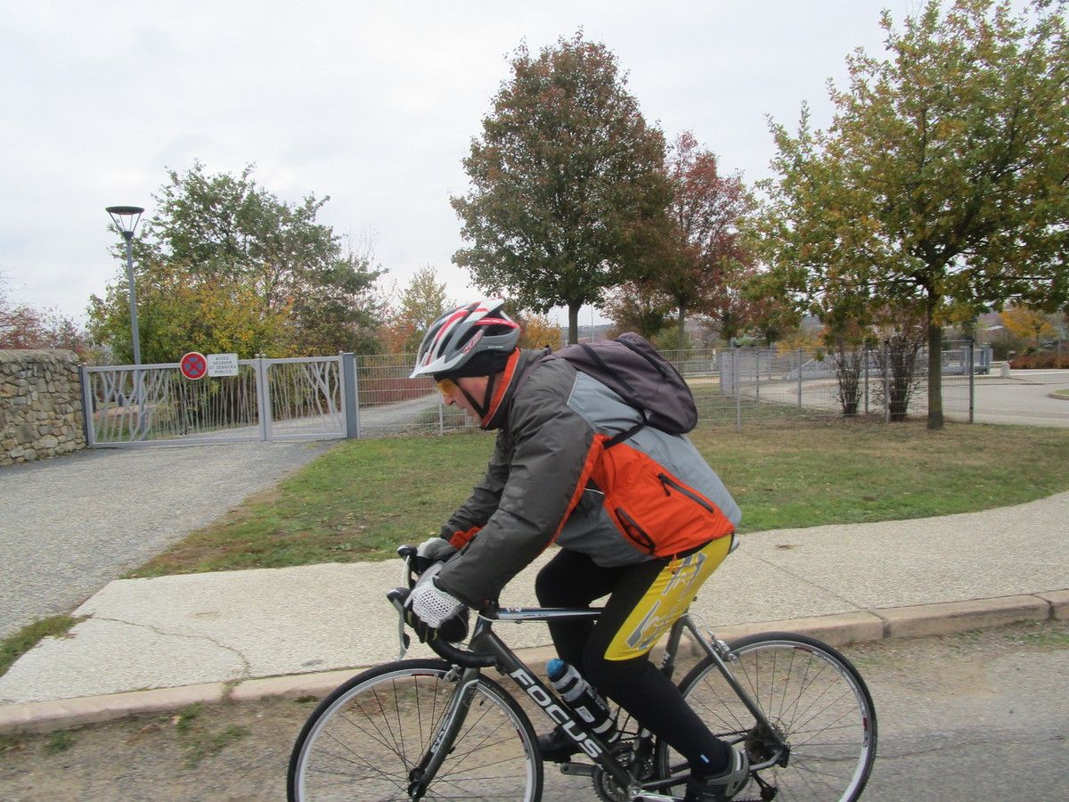 En cette saison, la campagne plutôt grise n'inspire pas à la rêverie. Dans les vergers les arbres d'aspects maigrichons continuent à perdre leurs feuilles jaunies. Les terres sont en partie labourées et semées de futures cultures dans l'attente d'une pousse printanière. La faune, en grande partie, est absente. Il reste, quand même, le charme des saisons. Toutefois, lors de notre éphémère passage les teintes de nos tenues cyclo colorent cette grisaille automnale. Encore un peu de patience et le temps quittera son manteau de froidure pour faire place à des jours plus cléments. Notre périple continue, Messimy (coucou Marie Claude et Louis), Taluyers, Montagny (coucou Alfred), Chassagny, St Andéol le Château.