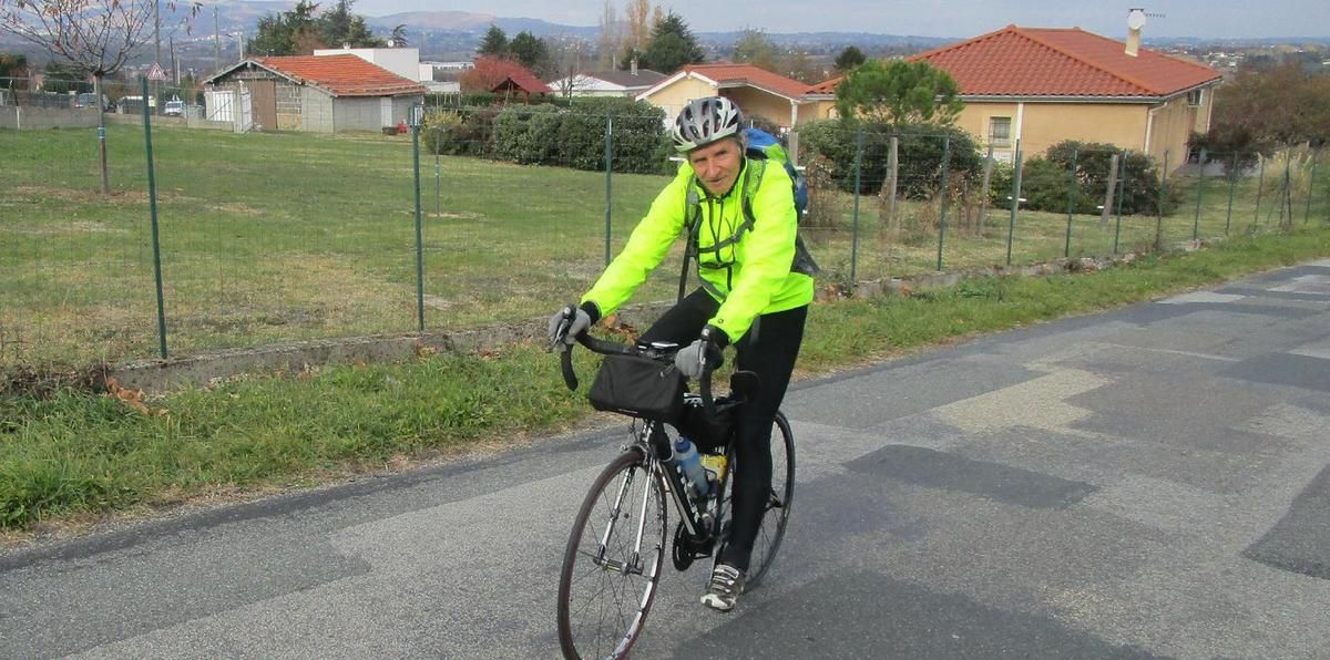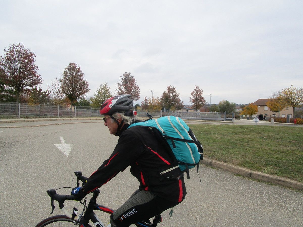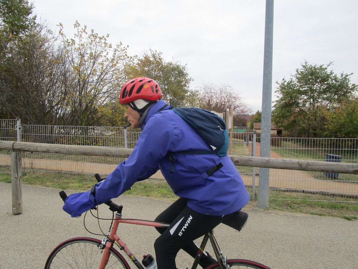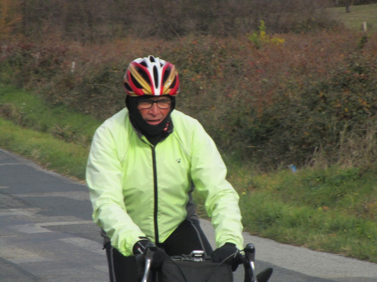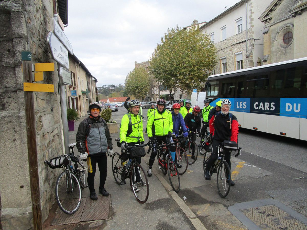 En cette saison, la campagne plutôt grise n'inspire pas à la rêverie. Dans les vergers les arbres d'aspects maigrichons continuent à perdre leurs feuilles jaunies. Les terres sont en partie labourées et semées de futures cultures dans l'attente d'une pousse printanière. La faune, en grande partie, est absente. Il reste, quand même, le charme des saisons. Toutefois, lors de notre éphémère passage les teintes de nos tenues cyclo colorent cette grisaille automnale. Encore un peu de patience et le temps quittera son manteau de froidure pour faire place à des jours plus cléments. Notre périple continue, Messimy (coucou Marie Claude et Louis), Taluyers, Montagny (coucou Alfred), Chassagny, St Andéol le Château.