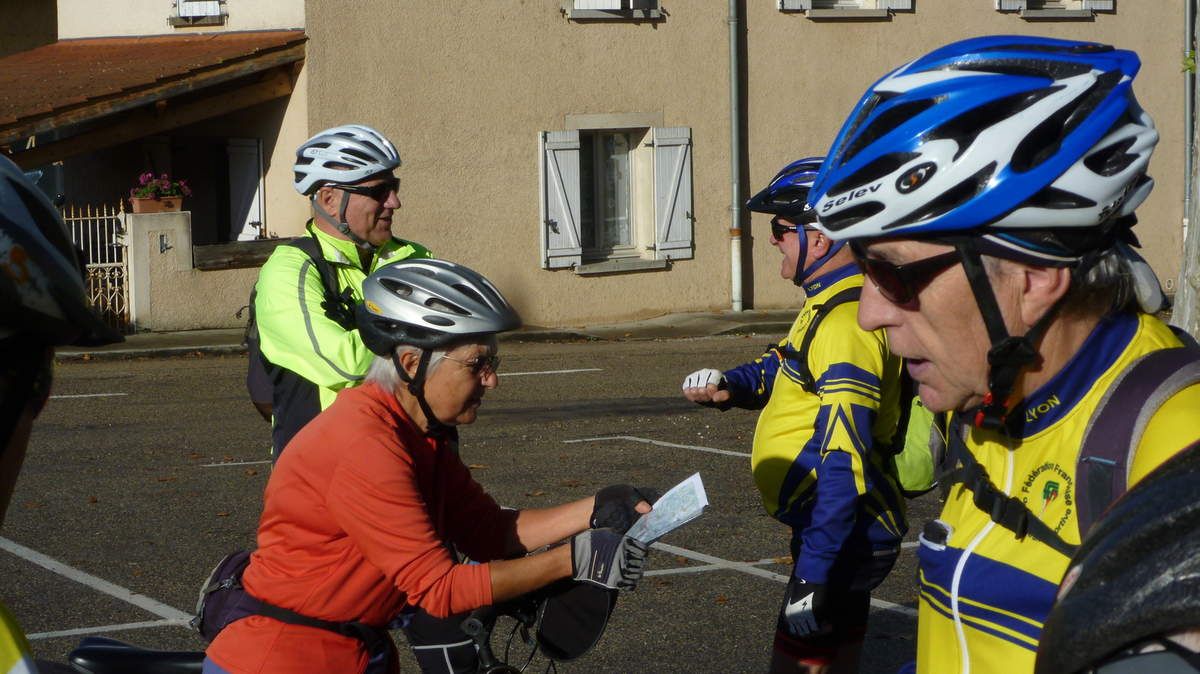 Un premier arrêt à Versailleux avec Noelle attentive au parcours prévu.